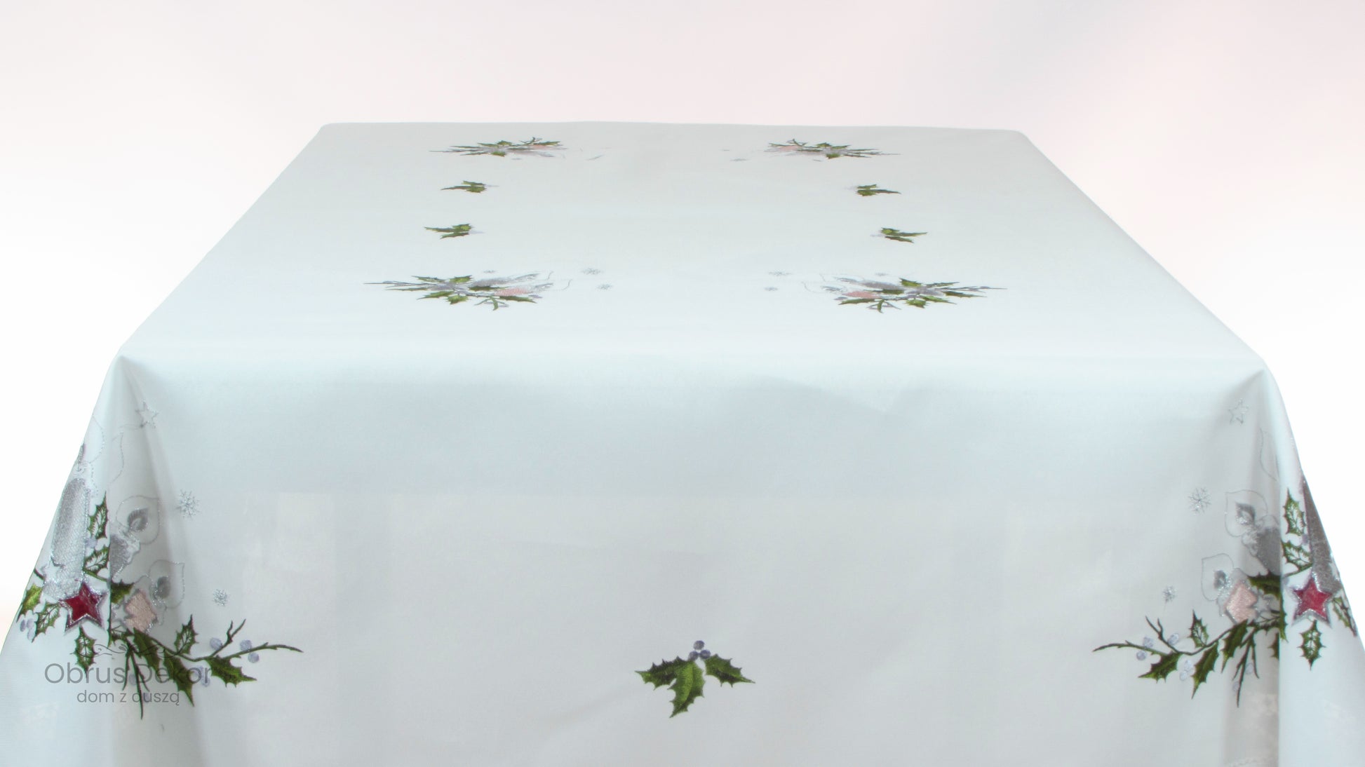 Wprowadź do swojej jadalni atmosferę spokoju i świątecznej elegancji. Ten stylowy obrus w kolorze śnieżnej bieli zdobi subtelny haft przedstawiający trzy świece, otoczone zimowym wiankiem z ostrokrzewu i gwiazd. Kolorystyka wzoru jest delikatna – dominują tu odcienie srebra, szarości i zieleni, przełamane jednym, wyrazistym akcentem w postaci czerwonej gwiazdki. Całość otacza szeroka, misterna koronka (gipiura) z motywem dzwonków, która nadaje dekoracji wyjątkowego, tradycyjnego charakteru.