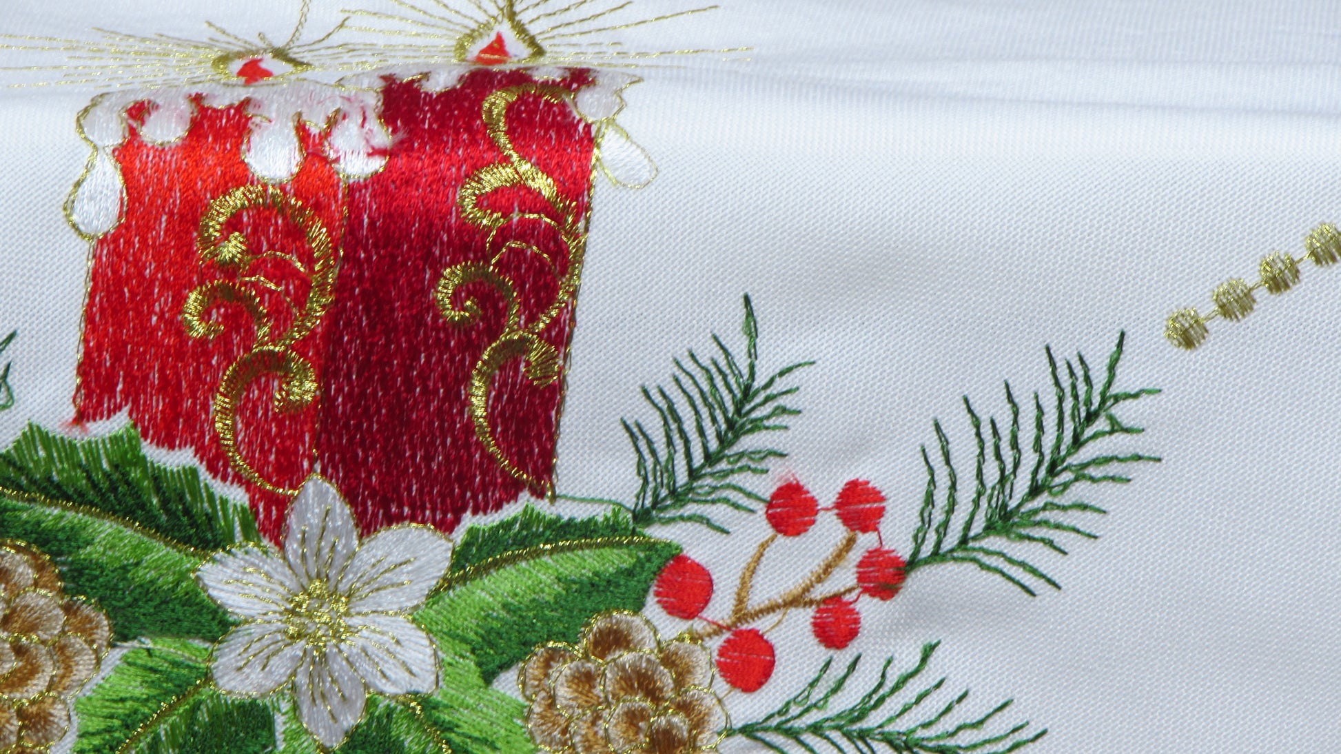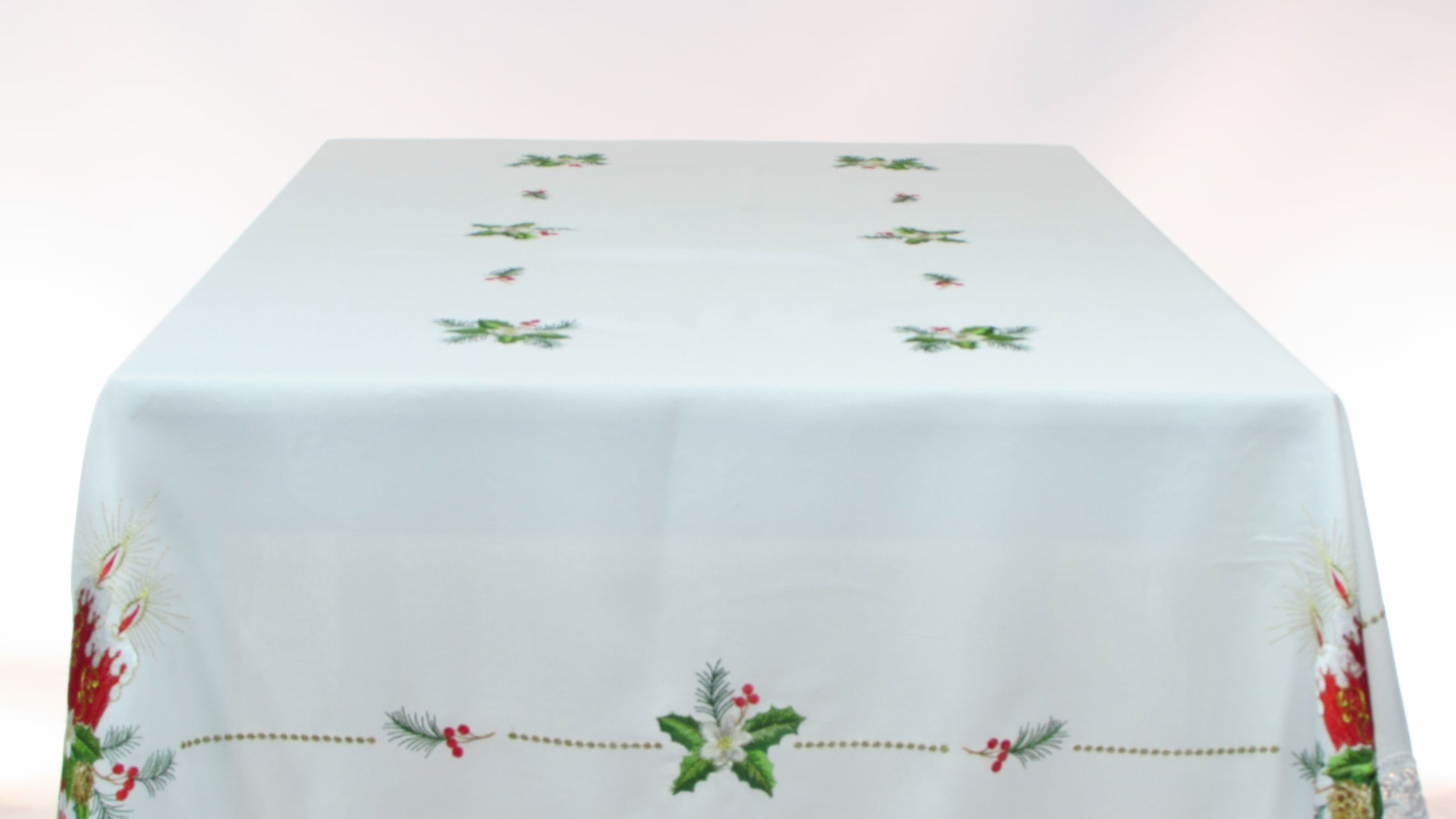Stwórz wyjątkową, wigilijną atmosferę dzięki temu eleganckiemu obrusowi. Biała tkanina została ozdobiona bogatym, kolorowym haftem przedstawiającym dwie świąteczne świece w otoczeniu zimowego stroika z szyszkami, ostrokrzewem i jarzębiną. Całość dopełnia misterna, szeroka koronka na brzegach, która dodaje dekoracji lekkości i klasy. Obrus doskonale prezentuje się zarówno bezpośrednio na stole, jak i jako nakładka na gładki obrus.