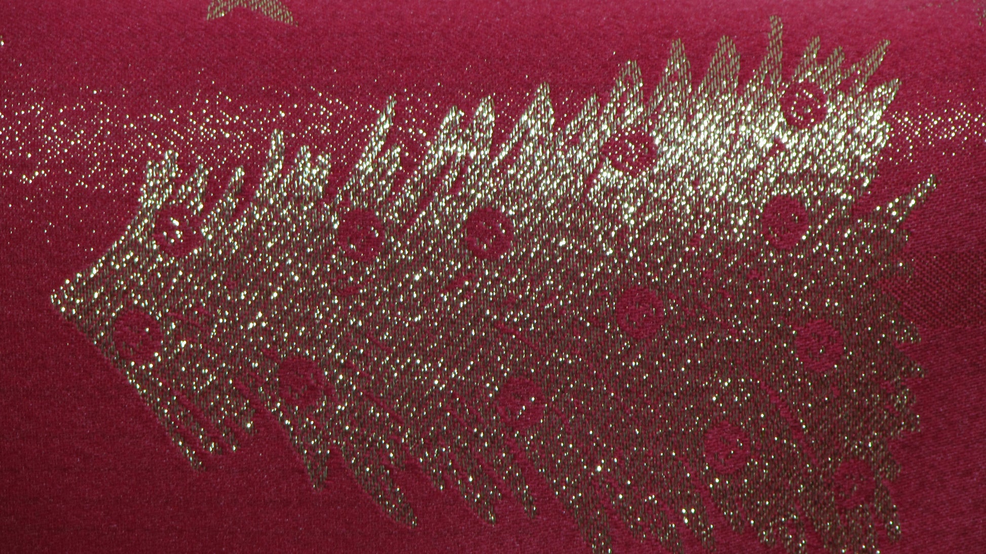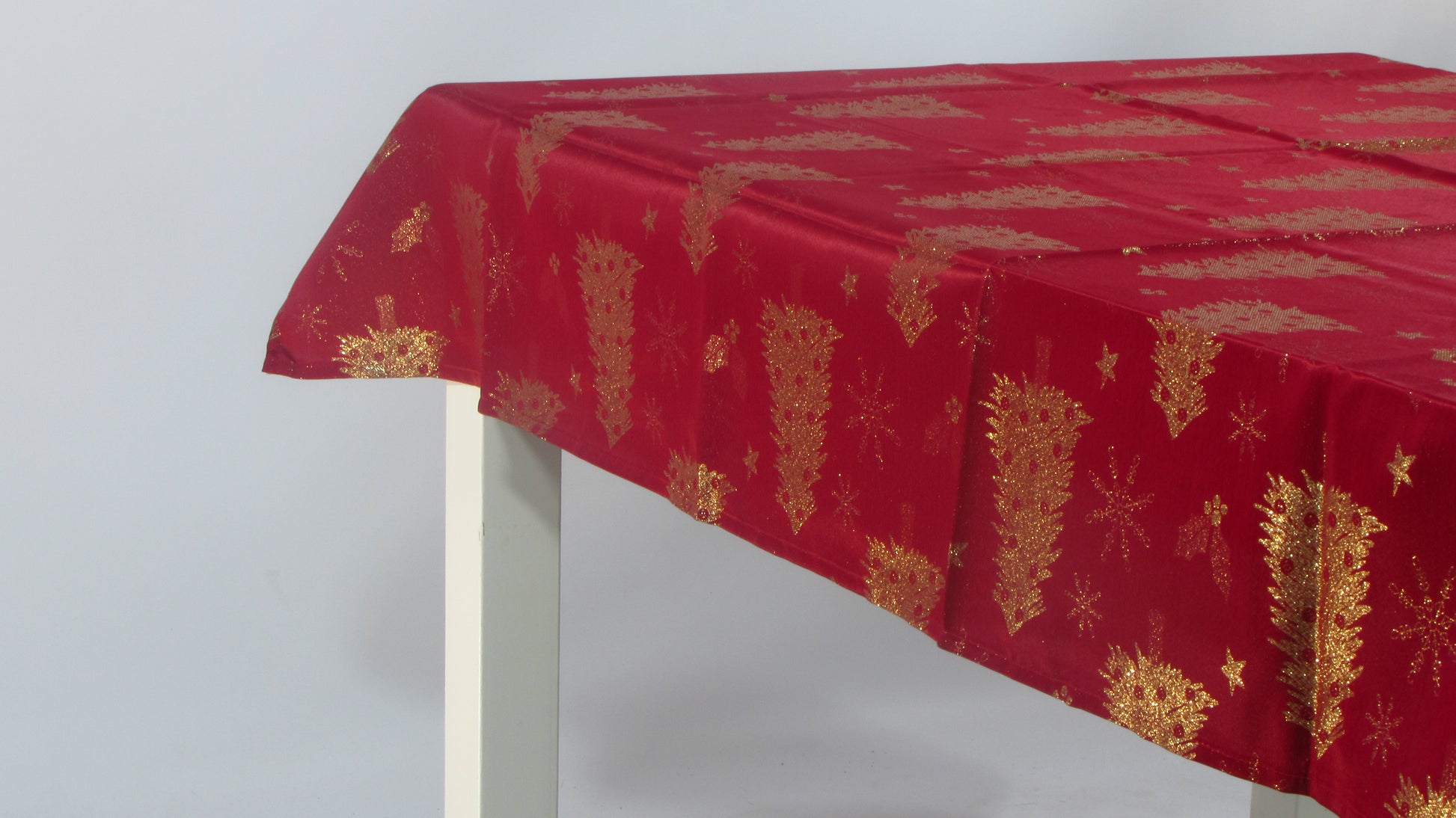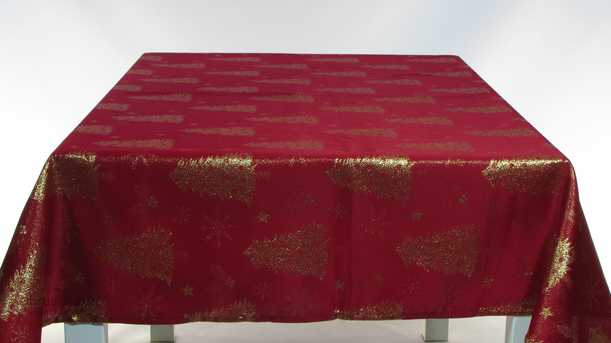 Jeśli zielona wersja to tajemniczy las, ten model to czysta, radosna energia Świąt. Postawiliśmy tu na ponadczasowy, królewski duet: nasyconą czerwień i połyskujące złoto. Cała powierzchnia tkaniny usiana jest regularnym wzorem stylizowanych choinek i drobnych gwiazdek, wykonanych metalizowaną nitką. Dzięki temu obrus nie potrzebuje bieżnika ani dodatkowych serwet – sam w sobie "ubiera" cały stół. Na zbliżeniu widać, jak gęsty splot złotej przędzy efektownie odbija światło, tworząc wyrazisty, niemal trójwymiarowy efekt na gładkim, czerwonym tle. To model, który wspaniale ociepla wnętrze i idealnie komponuje się ze światłem świec.
